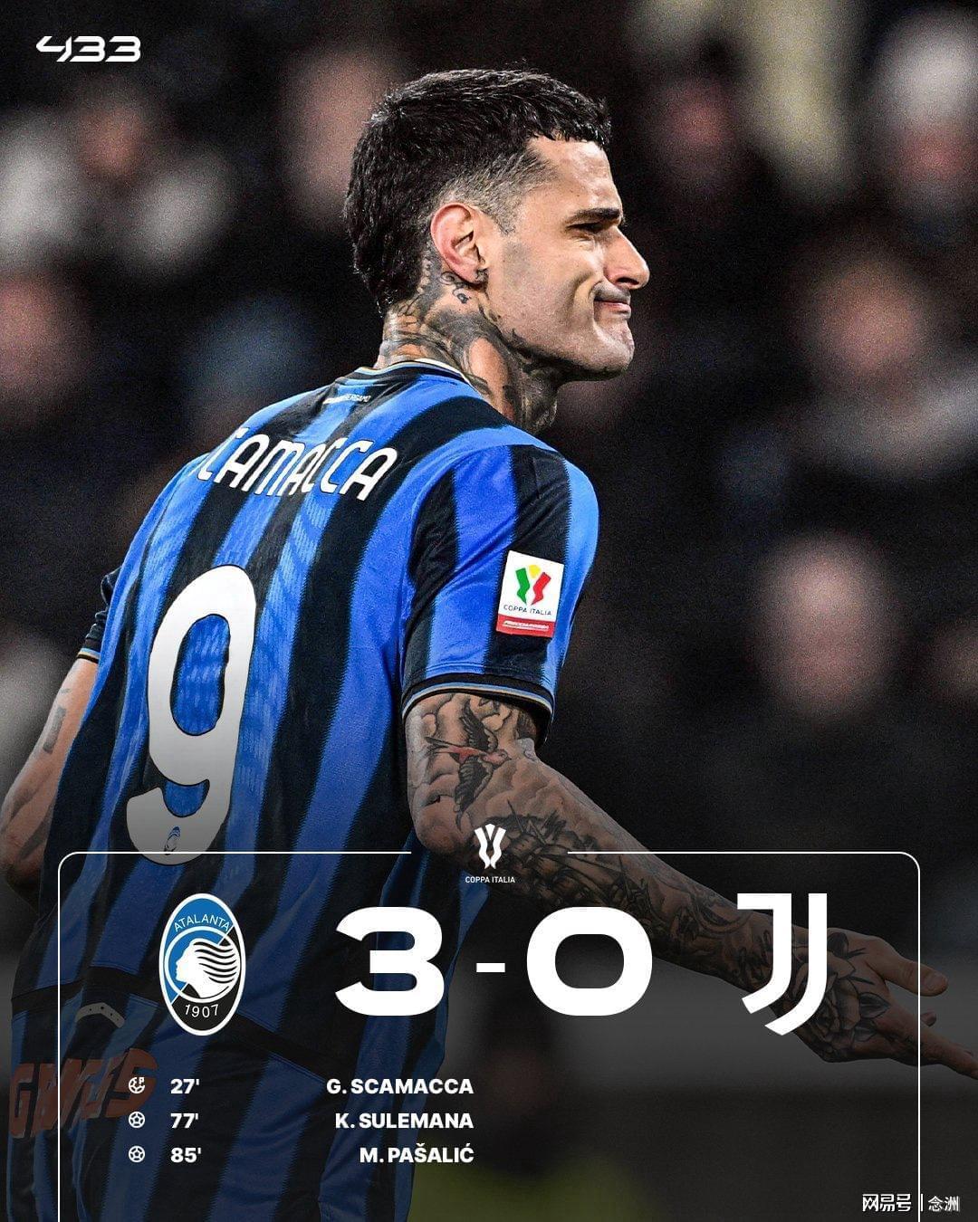意大利杯1/4决赛,尤文图斯0-3负于亚特兰大,无缘四强。小孔塞桑抽射中楣,布雷默送点,斯卡马卡点射首开记录,苏莱马纳替补建功,帕萨利奇破门。